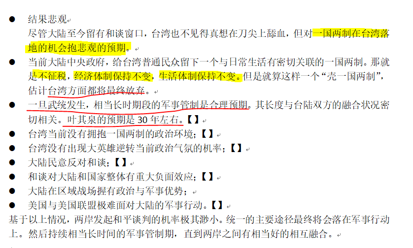 基于以上情况,两岸发起和平谈判的机率极其渺小。统一的主要途径最终将会落在军事行动上。然后持续相当长时间的军事管制期,直到两岸之间有相当好的相互融合。叶其泉的预期的军事管制期是30年左右。【6】